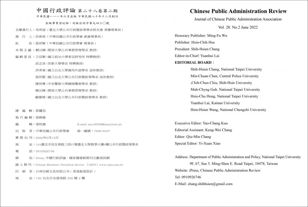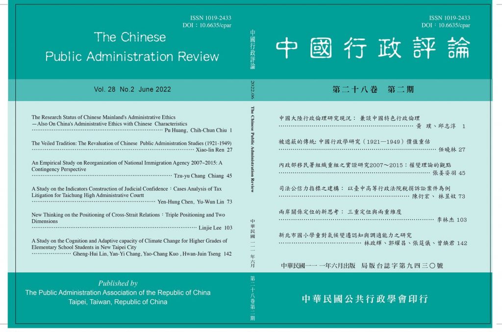 第 28 卷第 2 期 2022 年 6 月 15 日 01中國大陸行政倫理研究現況(黃璞、邱志淳) (4)下載 02被遮蔽的傳統 (任曉林) (4)下載 03內政部移民署組織重組之實證研究 (張姜姿羽)下載 04司法公信力指標之建構(林昱妏、陳衍宏) –下載 05兩岸關係定位的新思考^7三重定位與兩重維度 (李林杰)下載 06新北市國小學童對氣候變遷認知與調適能力之研究(郭耀昌等 )下載