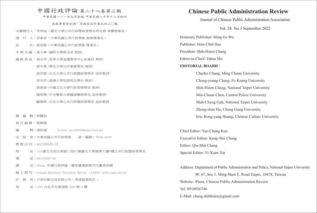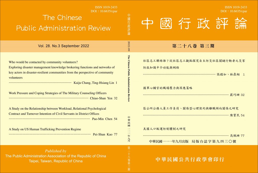第 28 卷第 3 期 2022 年 9 月 1 日 01社區志工聯絡誰?(張鎧如、林鼎翔) (三校)下載 02國軍心輔官職場壓力與因應策略(嚴巧珊) (三 校) (6)下載 03公務人員工作負荷1(陳寶民) (1)下載 04美國人口販運防制體制(高佩珊) (1)下載