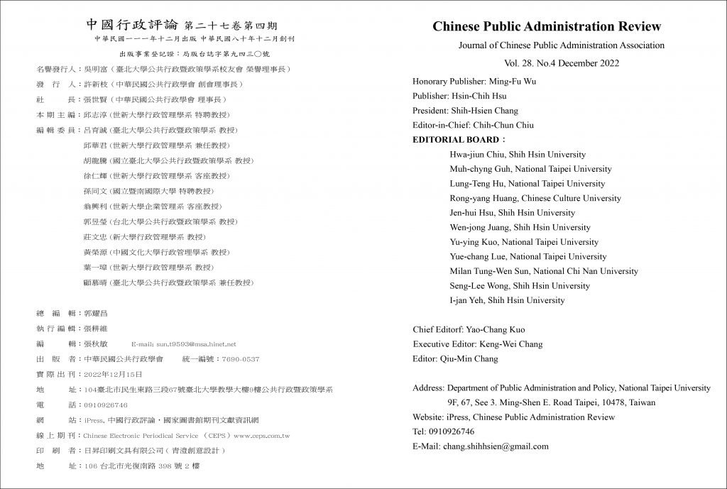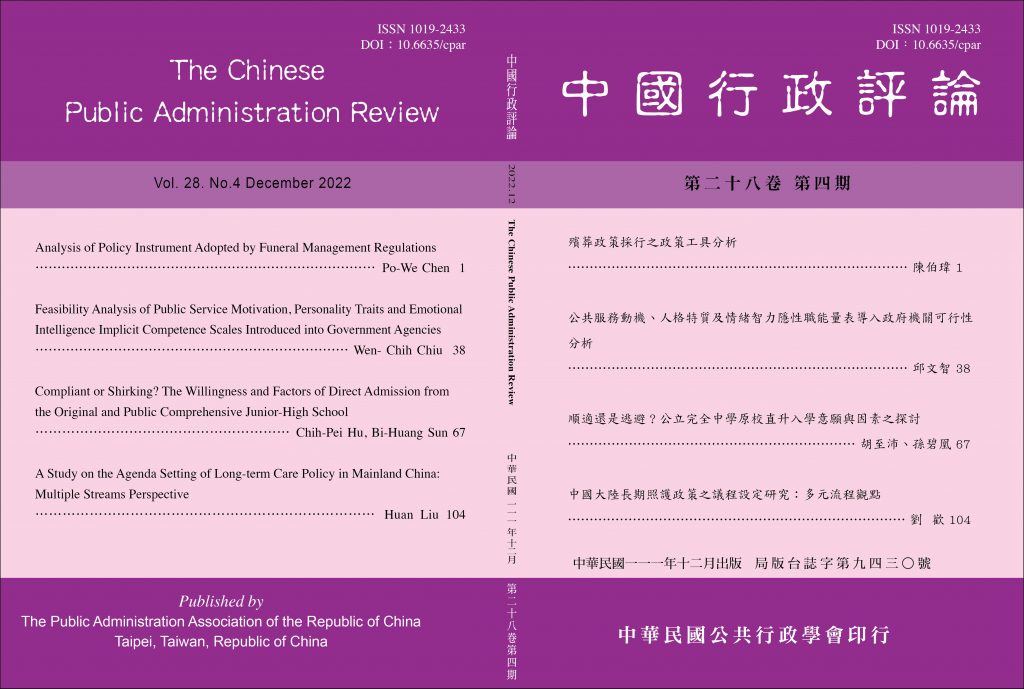 第 28 卷第 4 期 2022 年 12 月 15 日 01殯葬管理條例採行政策工具之分析1 (陳伯瑋) (3)下載 02公共服務動機、人格特質及情緒智力隱性職能量表1〈邱文智〉 (1) (2) (1)下載 03適還是逃避?公立完全中學原校直升入學意願與因素之探討1(胡至沛、孫碧凰) (3)下載 04中國大陸長期照護政策之議程設定研究〈劉歡修2)下載