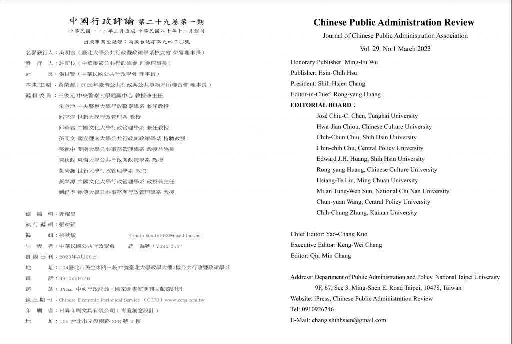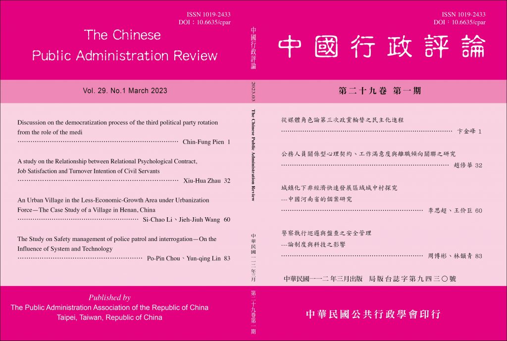 第 29 卷第 1 期 2023 年 3 月 20 日 01從媒體角色論第三次政黨輪替之民主化進程1 (卞金鋒PDF)下載 02公務人員關係型心理契約1(趙修華PDF3.20.)下載 03城鎮化下非經濟快速發展區域城中村探究1(李思超、王价巨PDF)下載 04警察執行巡邏與盤查之安全管理1(周博斌、林韻青PDF)下載