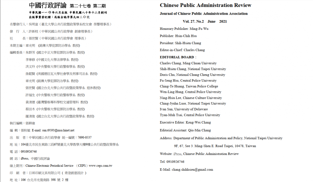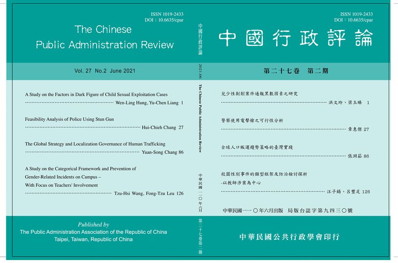 第 27 卷第 2 期 2021 年 6 月 30 日 01兒少性剝削案件通報黑數因素之研究 (洪文玲、梁玉臻)下載 02警察使用電擊槍之可行性分析(章惠傑)下載 03全球人口販運趨勢策略的台灣實踐(張淵菘)下載 04校園性別事件的類型框架及防治檢討探析(汪子錫、呂豐足)下載