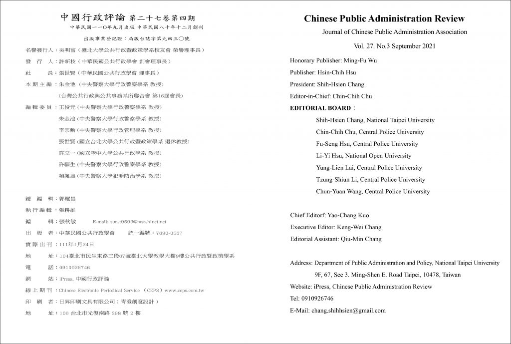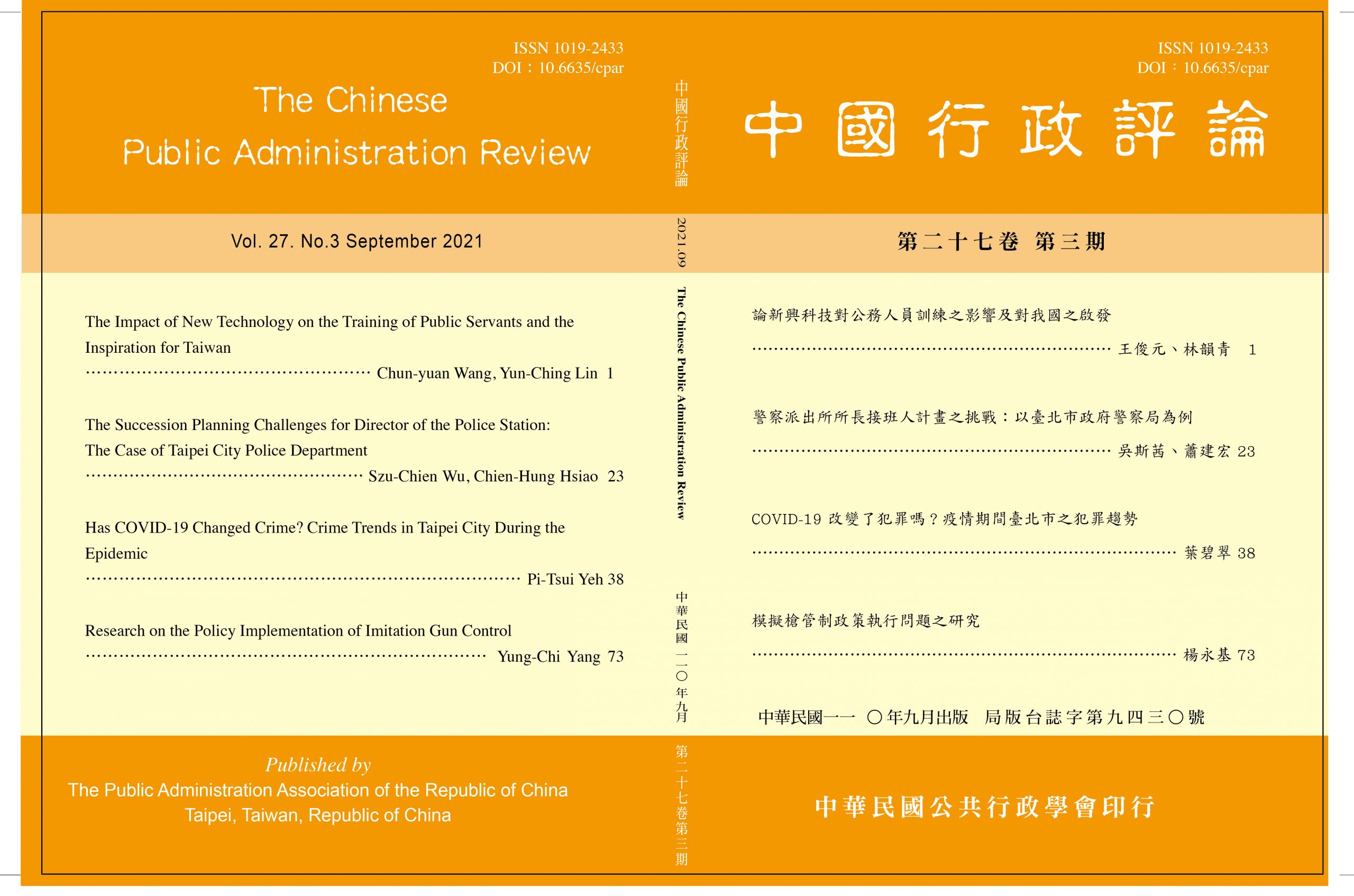 第 27 卷第 3 期 2021 年 12 月 12 日 01論新興科技對公務人員訓練之影響 (王俊元、林韻青)下載 02警察派出所所長接班人計劃之挑戰(吳斯茜、蕭建宏)下載 03.COVID-19_改變了犯罪嗎?(葉碧翠)下載 04模擬槍管制政策執行問題之研究(楊永基)下載