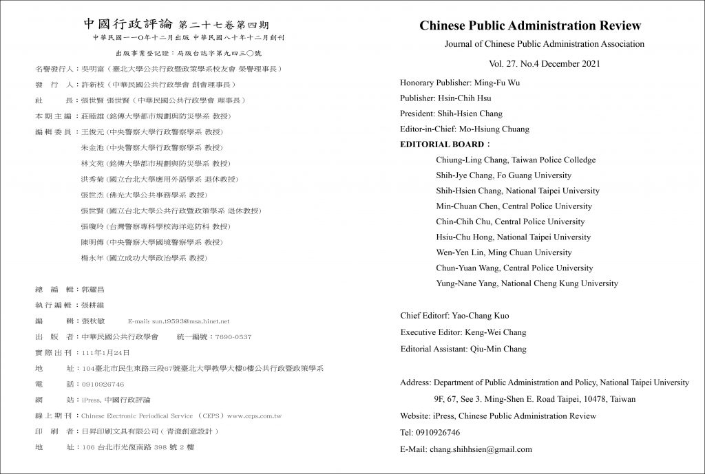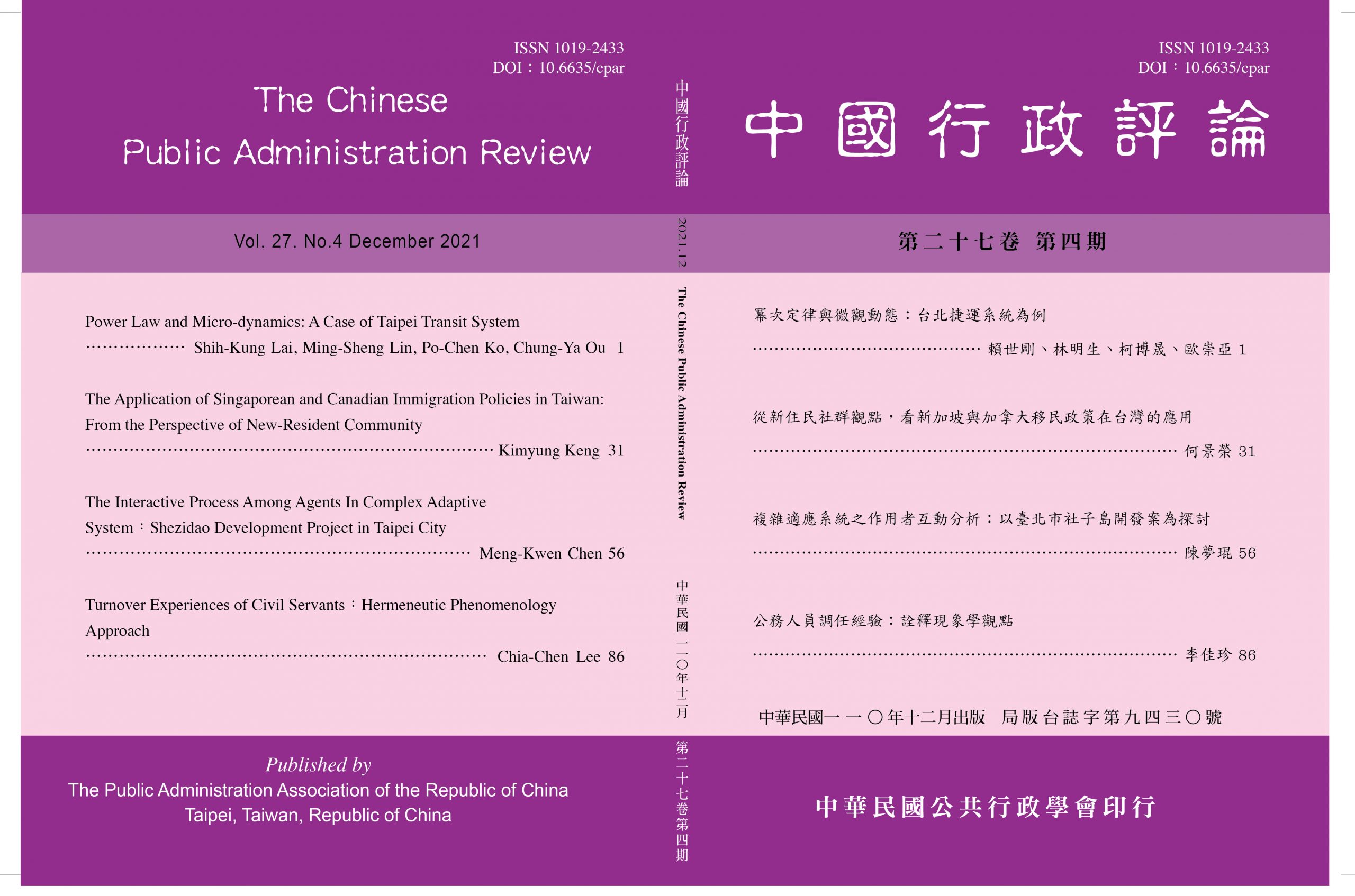 第 27 卷第 4 期 2021 年 12 月 30 日 01冪次定律與微觀動態 (賴世剛等 )下載 02移民研究 (何景榮)下載 03複雜適應系統之作用者互動分析(陳夢琨)下載 04公務人員調任經驗-詮釋現象學觀點2(李佳珍)下載