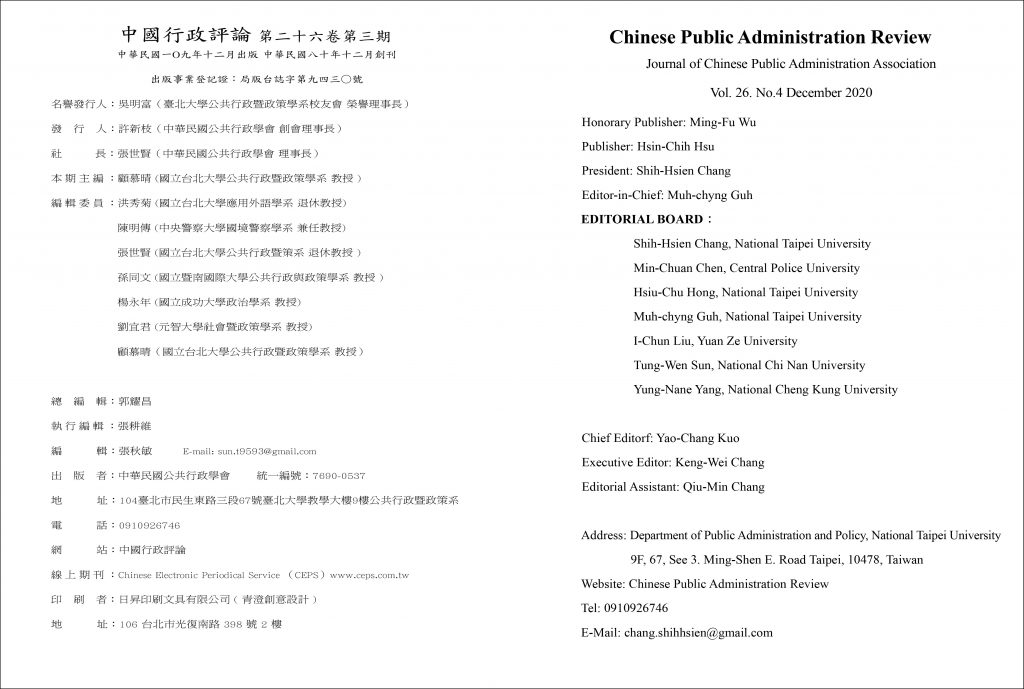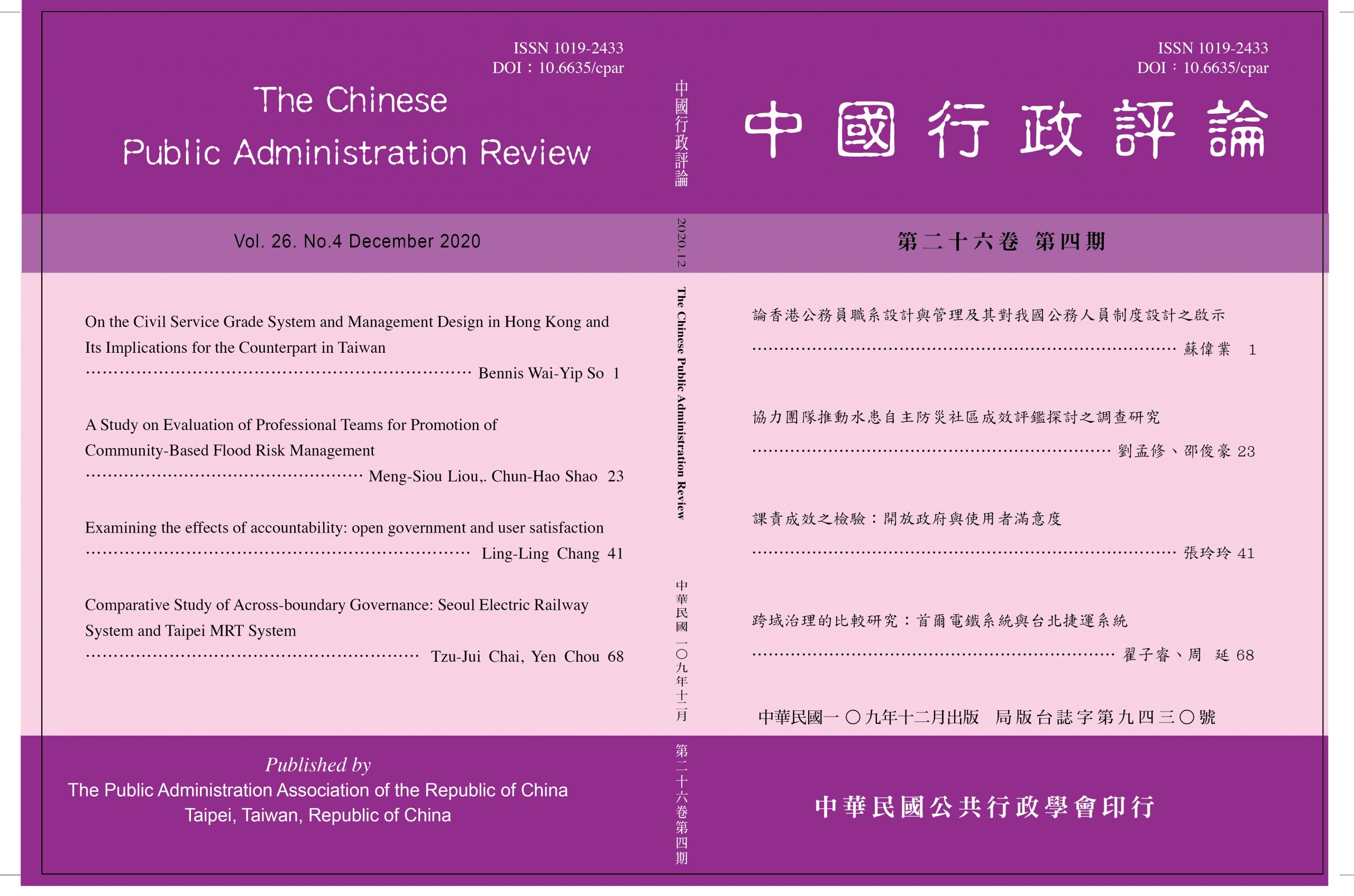 第 26 卷第 4 期 2020 年 12 月 30 日 01論香港公務員職系設計與管理及其對我國公務人員制度設計之啟示(蘇偉業)下載 02協力關係(劉孟修、邵俊豪)下載 03課責成效之檢驗^LL7開放政府與使用者滿意度(張玲玲)下載 04跨域治理的比較研究^7首爾電鐵系統與台北捷運系統 (翟子睿、周延)下載