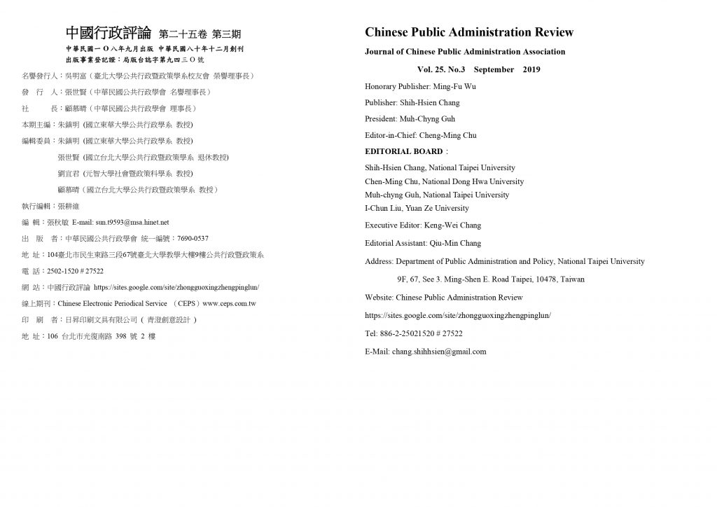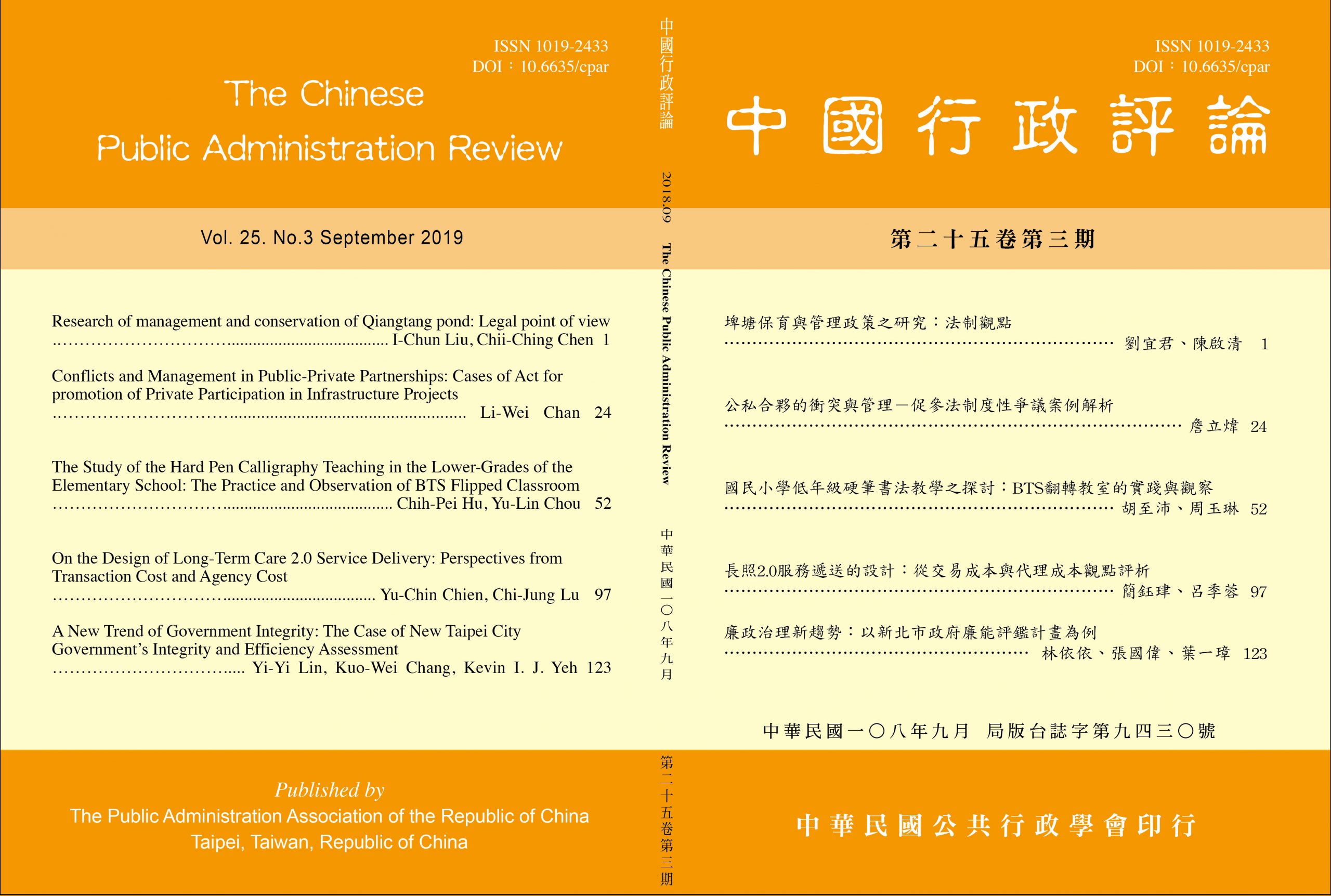 第 25 卷第 3 期 2019 年 12 月 12 日 01埤塘保育與管理政策之研究:法制觀點(劉宜君、陳啟清)下載 02公私合夥的衝突與管理-促參法制度性爭議之案例解析(詹立煒)下載 03國民小學低年級推動硬筆書法教學之探討(胡至沛、周玉琳)下載 04長照2.0服務遞送的設計(簡鈺珒、呂季蓉)下載 05廉政治理新趨勢-以新北市政府廉能評鑑計畫為例(葉一璋等))下載