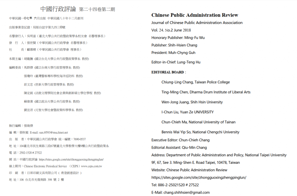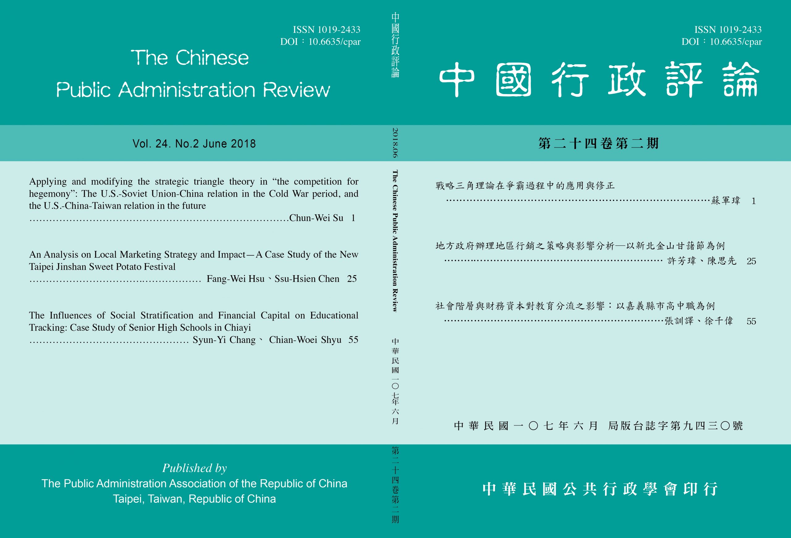 第 24 卷第 2 期 2018 年 6 月 30 日 01戰略三角理論在爭霸過程中的應用與修正-蘇軍瑋下載 02地方政府辦理地區行銷之策略與影響分析(許芳瑋、陳思先)下載 03社會階層與財務資本對教育分流之影響:以嘉義縣市高中職為例(張訓譯_徐千偉)下載