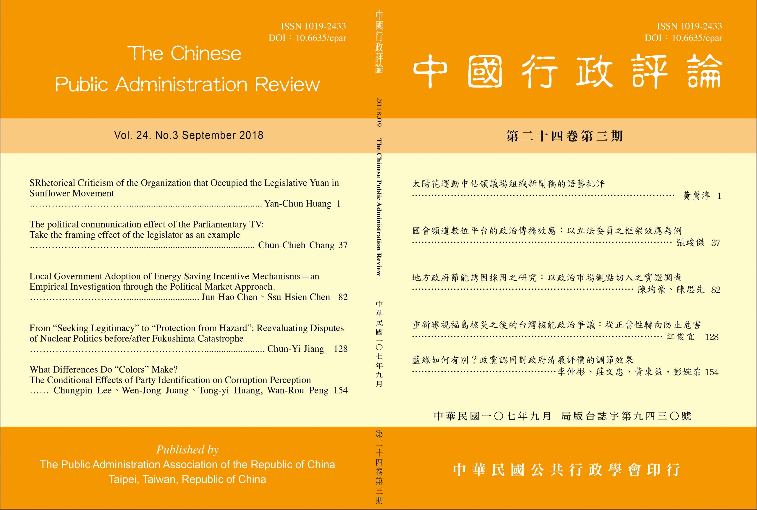 第 24 卷第 3 期 2018 年 12 月 12 日 01太陽花運動中佔領議場組織新聞稿的語藝批評-黃鷺淳下載 02國會頻道數位平台的政治傳播效應-張竣傑下載 03節能誘因機制之採用-陳均豪_陳思先下載 04重新審視福島核災之後的台灣核能政治爭議:從正當性轉向防止危害-江俊宜下載 05藍綠如何有別?政黨認同對政府清廉評價的調節效果-李仲彬等下載