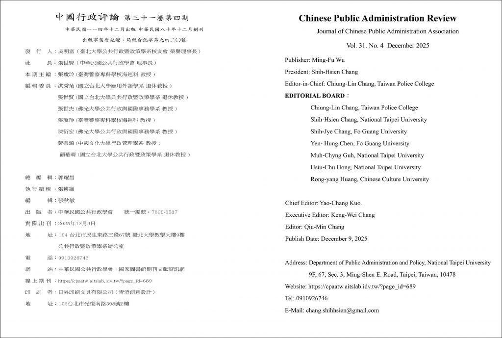 【中國行政評論】第31卷第4期 2025 年 12 月 12 日 01台海和平的第三條路 (楊惟任)下載 02軍隊性別平等研究的文獻計量分析(嚴巧珊 )下載 03從「形式國有」到「功能公共」 (劉皓仁) (3)下載 04Factors of Risks and Challenges(陳進益)下載 05我國基層警察人員團結權之研究(邱煒翔)下載 06注重公民參與的深度還是廣度(宋威穎)下載